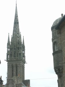 | La chapelle du Kreisker Son magnifique clocher, haut de 78 m, fait sa célébrité. Il est inspiré de la flèche de Saint-Pierrre de Caen, mais l'édifice breton, réalisé dans le granit, surpasse son modèle. Vauban a dit son admiration pour "cette merveille d'équilibre et d'audace". La partie haute, avec sa flèche relève du style normand ; sa partie basse, avec le quadrillage de ses meneaux et la balustrade de son balcon en surplomb, témoigne du style perpendiculaire anglais. |